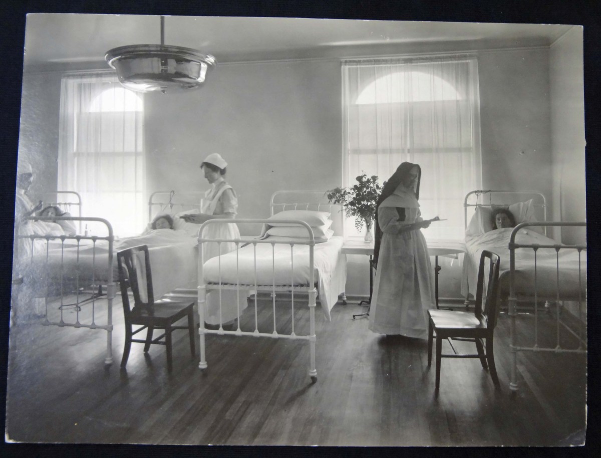 Description: This photograph is from St. Mary’s Hospital in San Francisco in 1911. It shows a patient room and a sister nurse. St. Mary’s was established in 1857 and run by the Sisters of Mercy, Burlingame Community. Today it is the oldest operating hospital in the city. The Sisters initally began their hospital service to meet unmet needs; the California Legislature refused any responsibility for caring for the sick during a cholera epidemic in 1855.