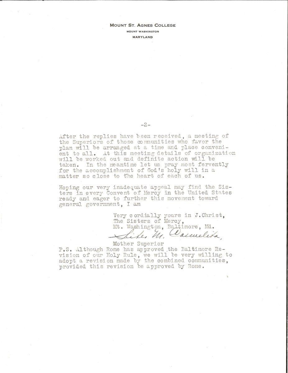 Description: This letter, written by Mother Mary Carmelita Hartman, was sent to every Mercy community in the United States asking the Mother Superiors to consider joining her in forming one general government for all Sisters of Mercy in the country.