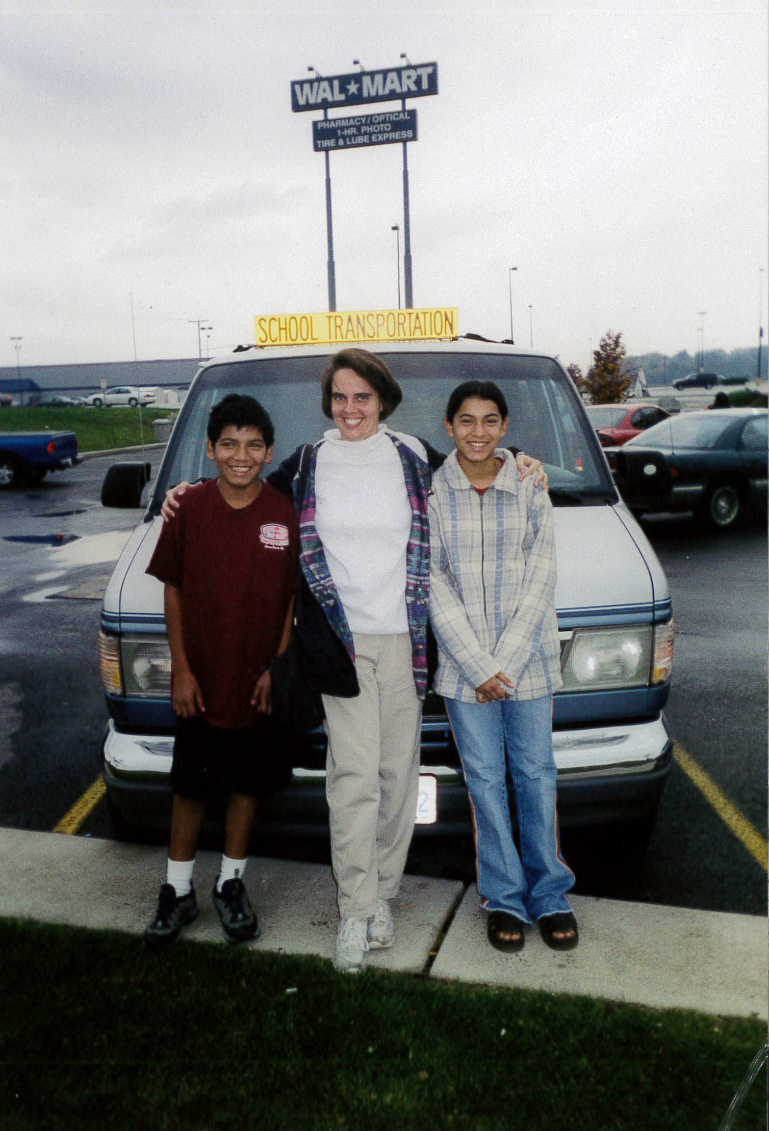 Description: Sister Michele Schroeck stands with two graduates from la Escuela de San Jose.