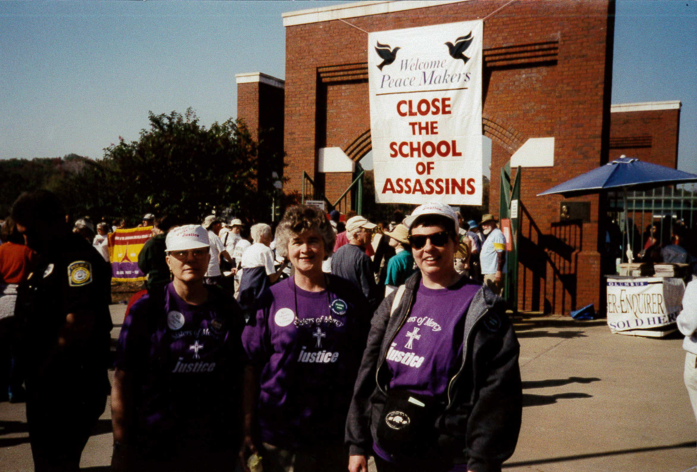Description: Sister Helen Marie Burns (middle) and two unidentified others at the 2001 SOA Watch.